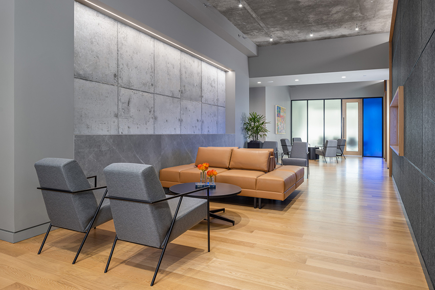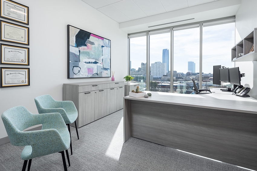 Our client wanted to do a 180º pivot from its current aesthetic, abandoning its dark, traditional look and replacing it with a more updated, modern one with light finishes, clean lines, and unexpected pops of color. Our Oklahoma City team partnered with the architect to select furniture to realize our client’s vision.