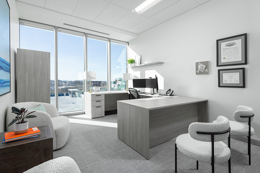 Our client also wanted their staff and attorneys to be able to personalize their private spaces. To do this, we created a “menu” of items to choose from. This included several desk options (with the same light and neutral finishes) that could be styled with shelves, cubbies, cabinets, or other features. It also included side chairs and guest chairs in several styles, colors, and fabrics. This approach allowed everyone to have an office that reflected their personal tastes while still preserving a cohesive overall aesthetic.